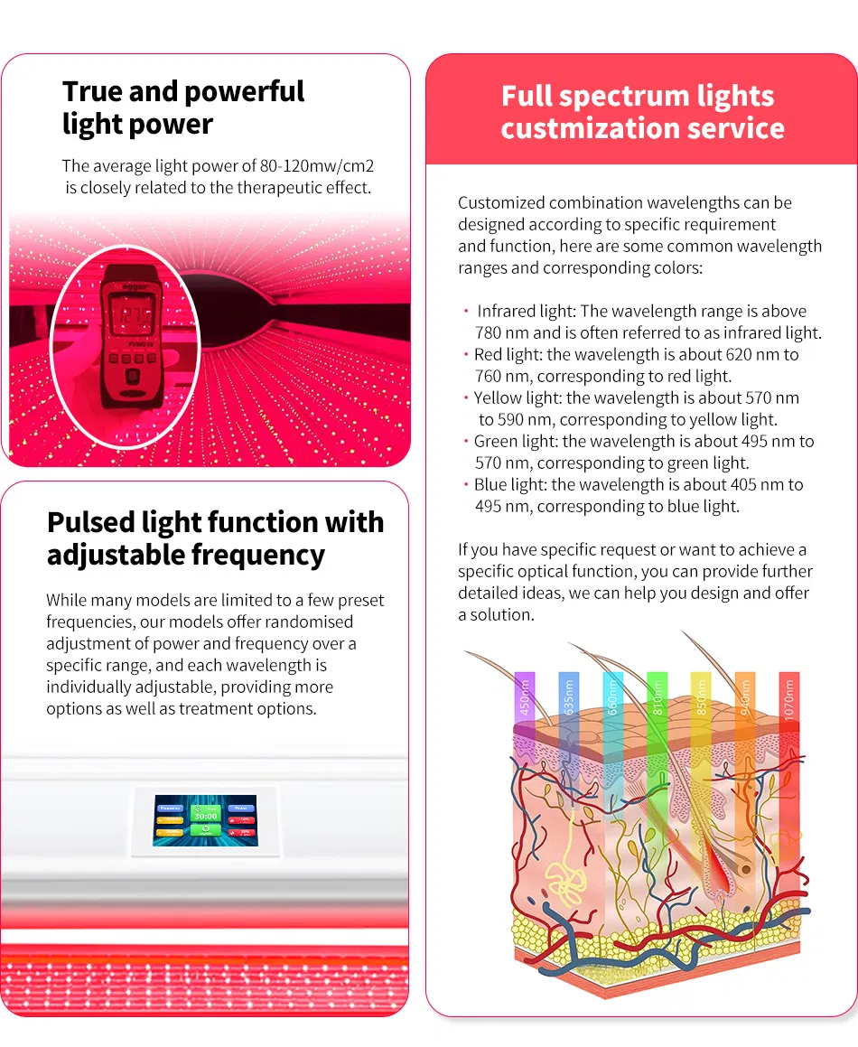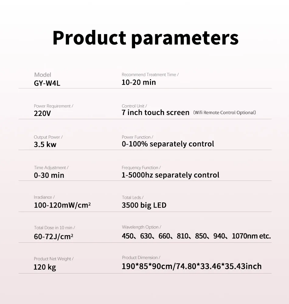 With 3700pcs Angle Led Light Beams, which make light more focus and deliver more light energy to users, the output power is up to 3.5KW, irradiation power 80-120mW/cm2.
